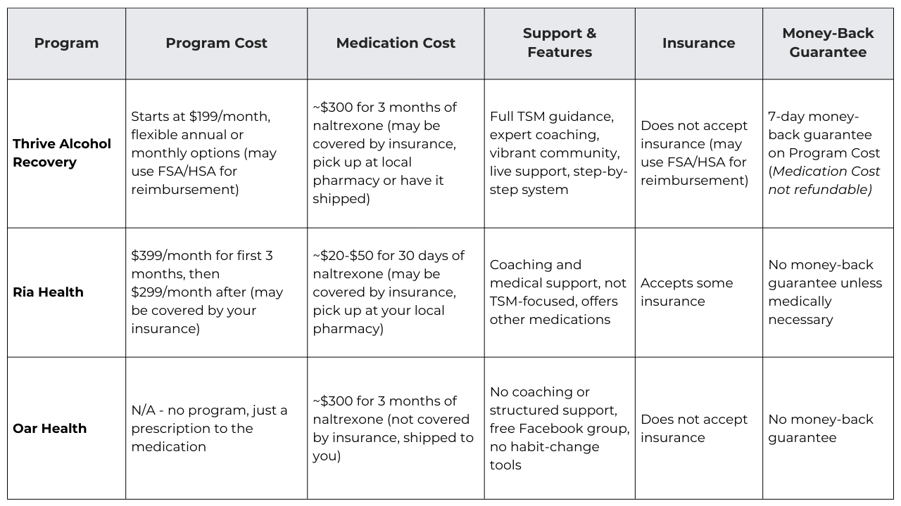 Cost Comparison: Thrive Alcohol Recovery vs. Ria Health vs. Oar Health